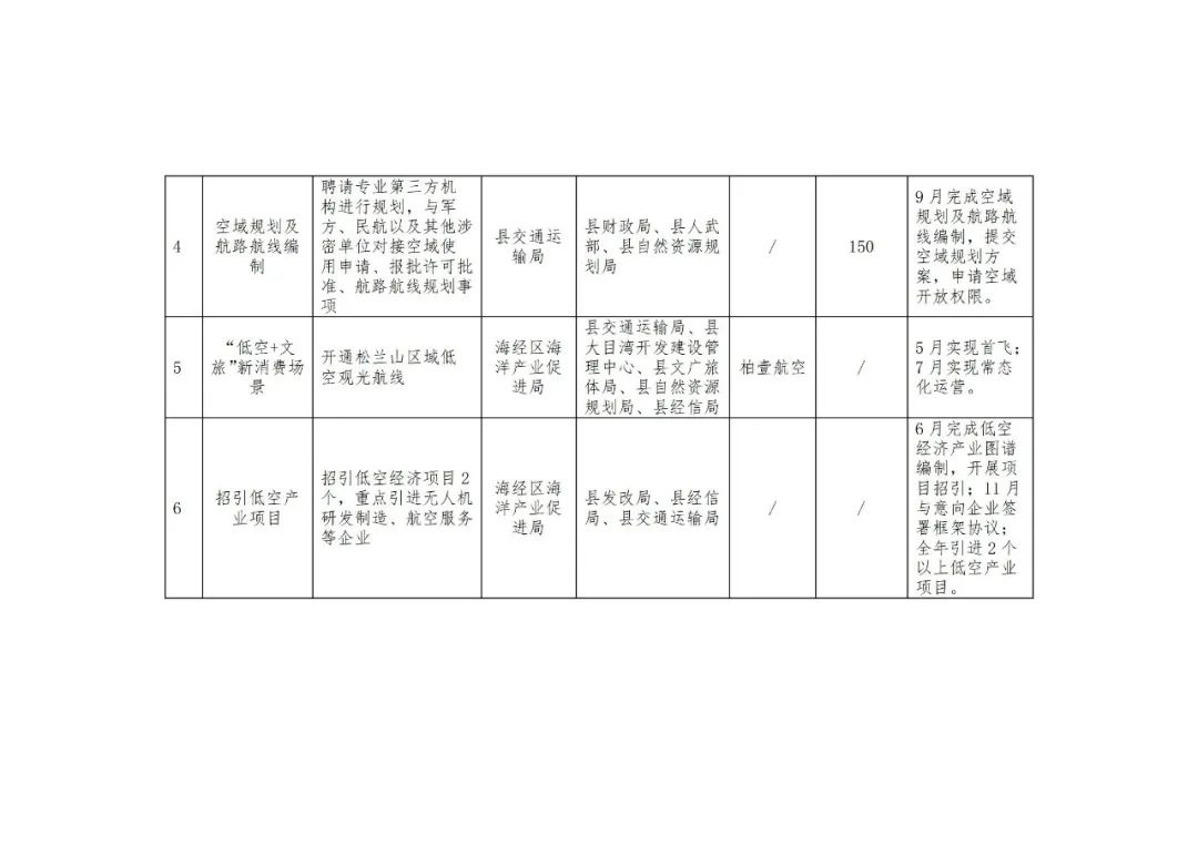 4.強化低空安全管理。構建低空安全管理機制,明確各方管理責任,研究制定應急處置管理辦法,加強對相關人員的教育培訓,提升風險防控和安全保障能力。(縣公安局牽頭,縣交通運輸局、海經區海洋產業促進局、縣應急管理局等單位配合)