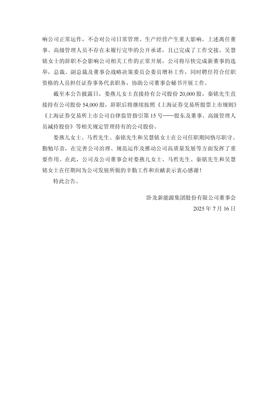 7月16日,臥龍新能源集團(tuán)股份有限公司(簡(jiǎn)稱:臥龍新能)發(fā)布關(guān)于公司董事、高級(jí)管理人員及證券事務(wù)代表辭職的公告。