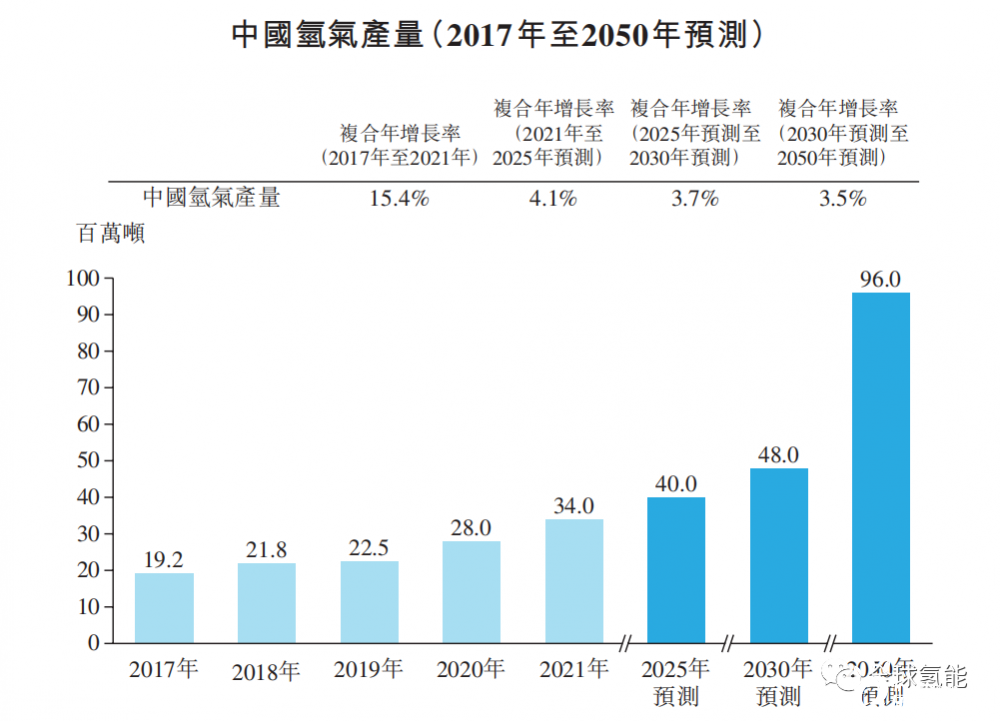 同時,隨著氫能產業的產業化及氫氣生產、儲存及運輸技術的進步,綠氫將成為未來制氫的主流方法,中國的氫氣平均價格預期也將由2021年的現行價格人民幣60至80元/千克(未扣除補貼)降至2025年至2030年的人民幣30元/千克以下,于2050年預期將進一步降至人民幣10元/千克以下。