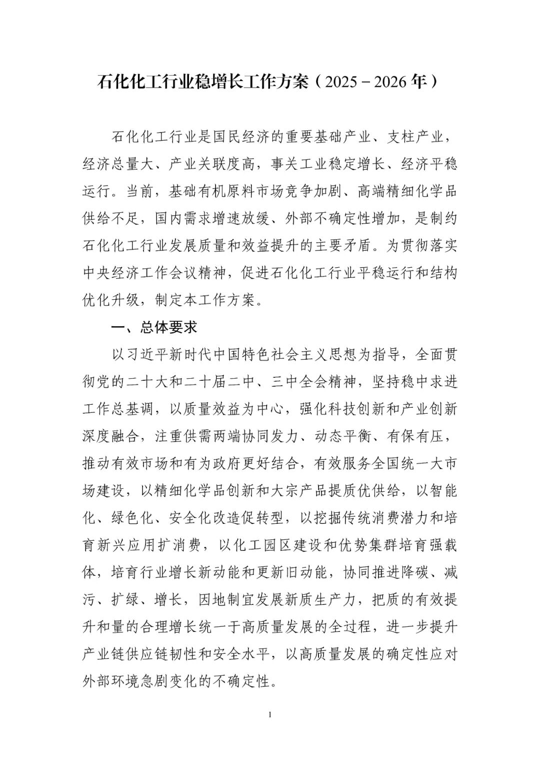 現(xiàn)將《石化化工行業(yè)穩(wěn)增長(zhǎng)工作方案(2025—2026年)》印發(fā)給你們,請(qǐng)結(jié)合實(shí)際認(rèn)真抓好落實(shí)。