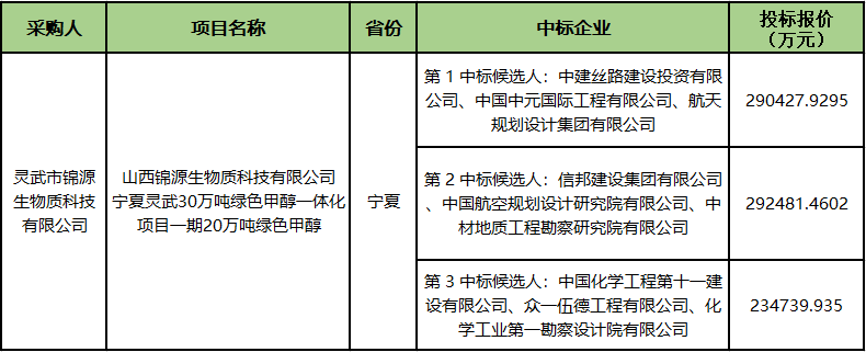 近日,山西錦源生物質科技有限公司寧夏靈武30萬噸綠色甲醇一體化項目一期20萬噸綠色甲醇中標候選人公示。