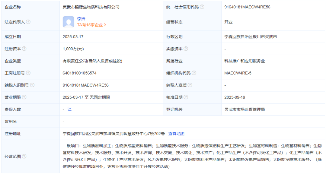 公開資料顯示,靈武市錦源生物質科技有限公司于2025年3月17日成立,注冊資本1000萬元,法定代表人為李浩。由美錦能源集團旗下山西錦源生物質科技有限公司全資持股。
