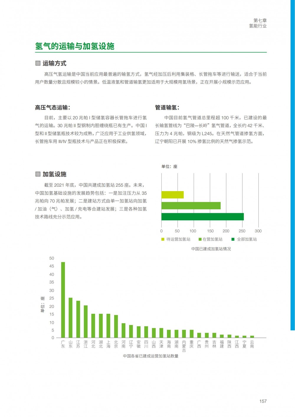 氫氣儲運:截至 2021 年底,中國共建成加氫站 255 座。未來,中國加氫基礎設施的發展趨勢包括:一是加注壓力從 35兆帕向 70 兆帕發展;二是建站方式由單一加氫站向加氫/ 加油(氣)、加氫 / 充電等合建站發展;三是各種加氫技術路線充分示范應用。