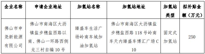 根據《佛山市南海區促進加氫站建設運營及氫能源車輛運行扶持辦法(修訂)》(南府辦〔2020〕3 號)等有關文件的要求,南海區發改局局開展了南海區 2022 年度加氫站建設區級財政補貼資金的申報工作。經經企業自愿申報、聘請第三方機構對申報材料進行核查、會同區住房城鄉建設和水利局進行聯合審核等程序,佛山市申堯新能源有限公司建設的臻盛車生活廣場嶺南車城加油加氫站符合南海區加氫站建設區級財政補貼條件,現將南海區加氫站建設區級財政補貼資金擬發放情況予以公示,情況如下: