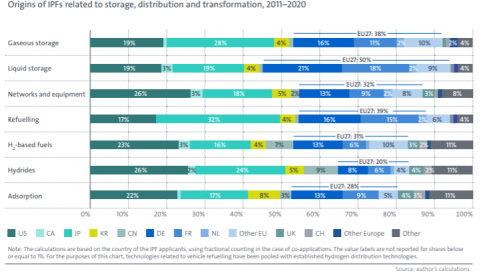 2001-2020年期間,氣候驅動的技術產生的國際專利數量是現有技術的兩倍多。如圖5所示,歐洲引領氫儲運專利發展。2011-2020年期間,歐洲領導了氫儲運領域的專利活動。在液氫環節占比達到50%,氣態儲運環節占比達到38%,加注環節達到39%,供氫網絡占比達到32%。在低碳氫基燃料和固態儲氫方面歐洲同樣也處于領先地位。美國則在供氫網絡(占比26%)、氫基燃料(占比23%)、氫化物(占比26%)及吸附(占比22%)等方面表現活躍,但在其他已建立的氫運輸及儲存技術中占比較低。