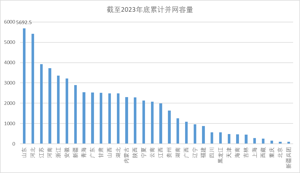 截至2023年底全國光伏累計并網容量60891.8萬千瓦,其中山東省并網容量5692.5萬千瓦,占全國裝機并網量的9.35%,列全國第一。