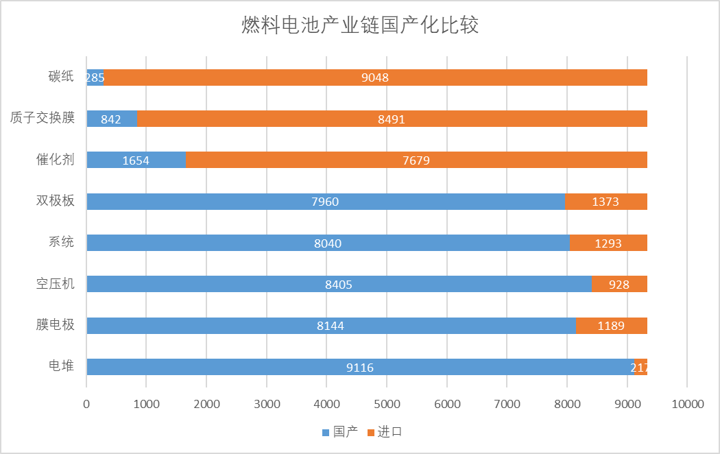 中國氫能典型的激勵政策是燃料電池示范群的“以獎代補”,補貼的是燃料電池的8大核心零部件,其中難度最高的是碳紙、質子交換膜和催化劑,目前雙極板、膜電極、空壓機、電堆、系統的國產化率均已超過80%,而催化劑國產化率不到20%,碳紙、質子交換膜國產化率不足10%,成為燃料電池行業最大的瓶頸。